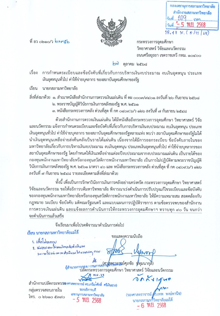 ขอนัดหารือ เรื่อง การติดตามผลการดำเนินการตามข้อเสนอแนะกรณีการกำหนดระเบียบและข้อบังคับที่เกี่ยวกับการบริหารงบประมาณ งบเงินอุดหนุนประเภทอุดหนุนทั่วไป ค่าใช้จ่ายบุคลากรของสถาบันอุดมศึกษาของรัฐ